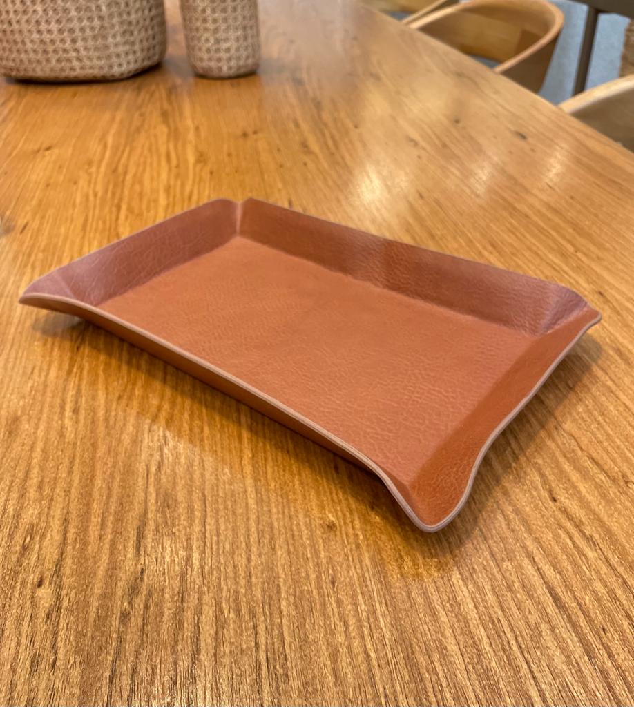 BANDEJA DE METAL REVESTIDA COM TECIDO COURO MARRON 29X19