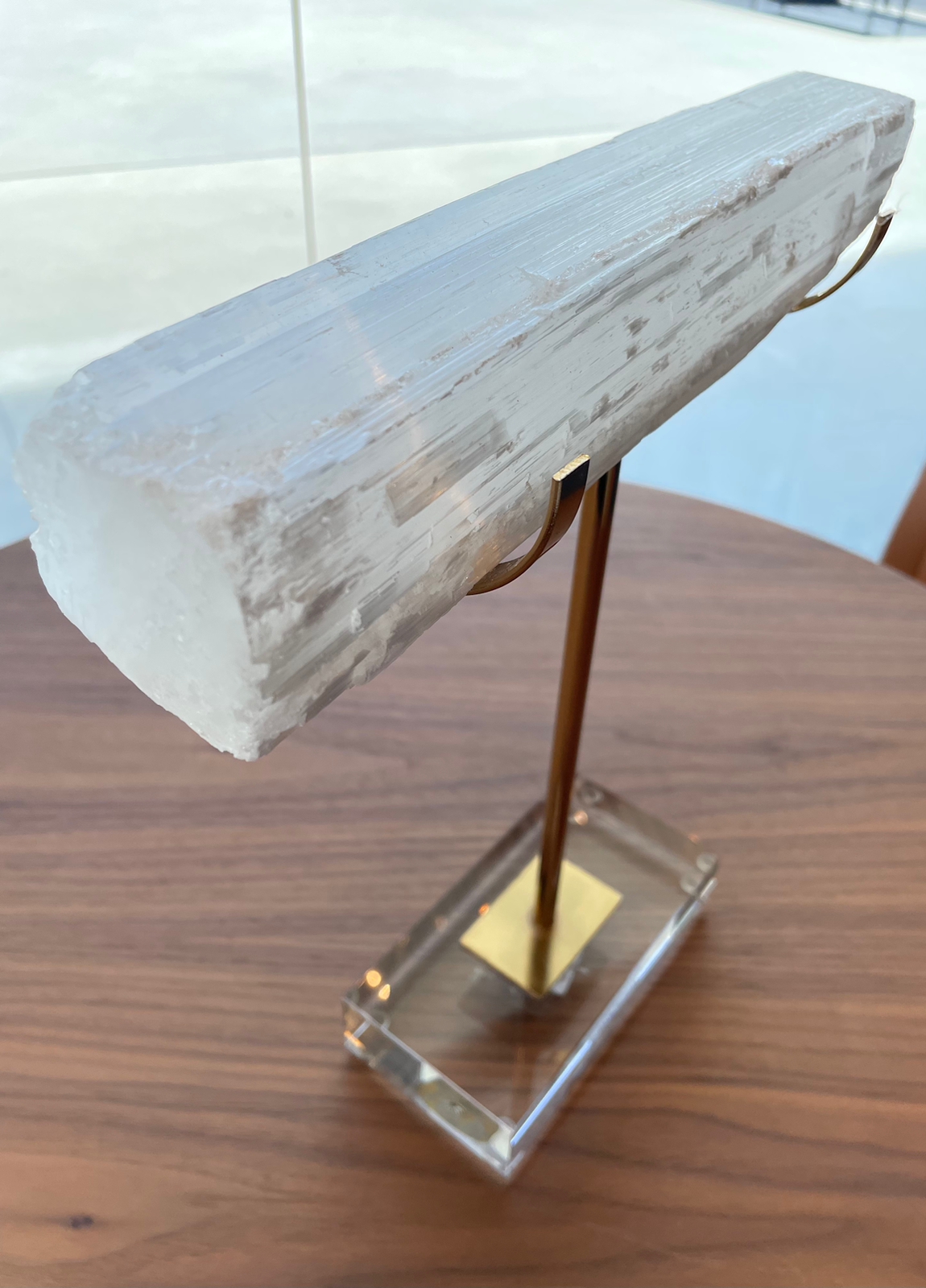 ESCULTURA EM METAL DOURADO BASE EM VIDRO E MARMORE QUARTZO