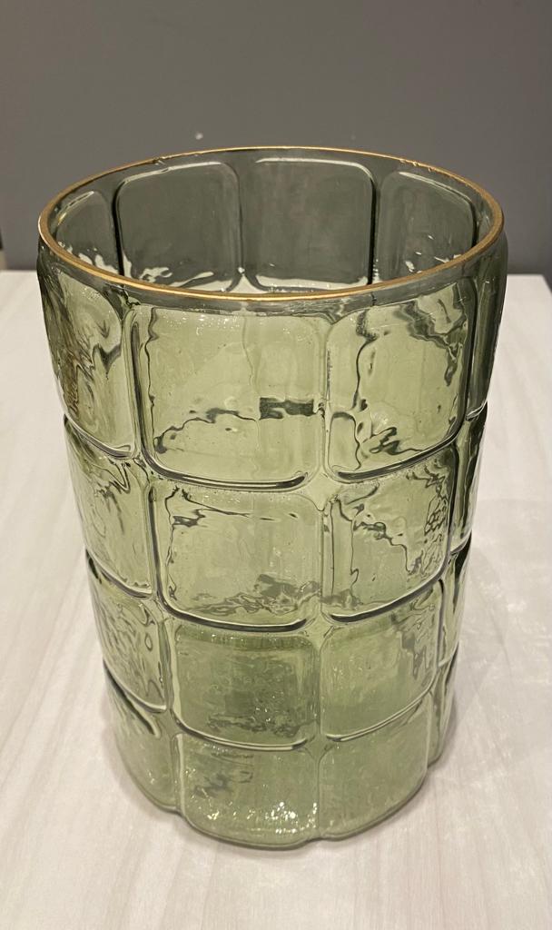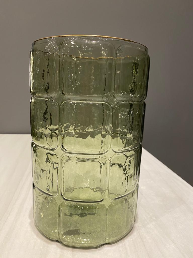 VASO DE VIDRO VERDE COM DETALHES DOURADO 15CM X 15CM X 23CM